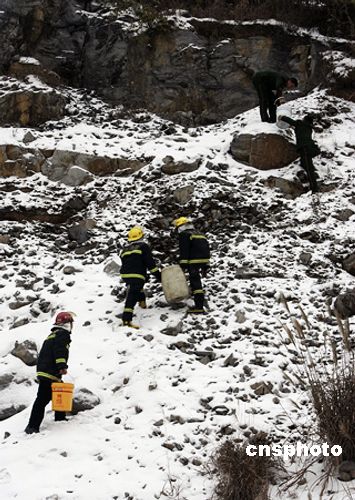 1月31日,重慶消防官兵為被困在大山中的民工送水。1月11日以來,重慶遭遇罕見持續(xù)低溫天氣,連日雨雪交加,造成27個(gè)區(qū)縣、520余萬人受災(zāi),17天內(nèi)發(fā)布了77起災(zāi)害性天氣預(yù)警信號(hào)。中新社發(fā) 萬明 攝