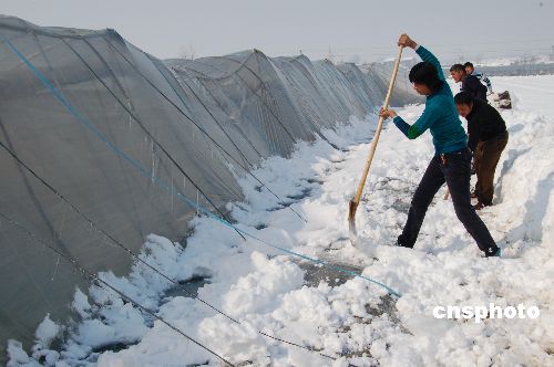 1月31日,安徽省含山縣仙蹤鎮唐莊村村民正在整理被大雪壓塌的草莓大棚。當日,天氣放晴,當地農民立即開展生產自救,減少雪災造成的損失。中新社發 田斌峰 攝