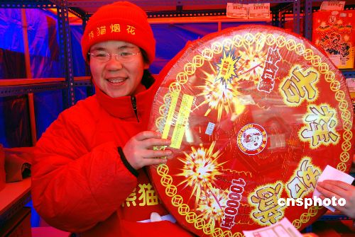 春節將至,北京的煙花銷售開始。1月31日,一名煙花銷售人員在北京文慧橋附近的煙花銷售點展示煙花產品。中新社發 楊慧峰 攝