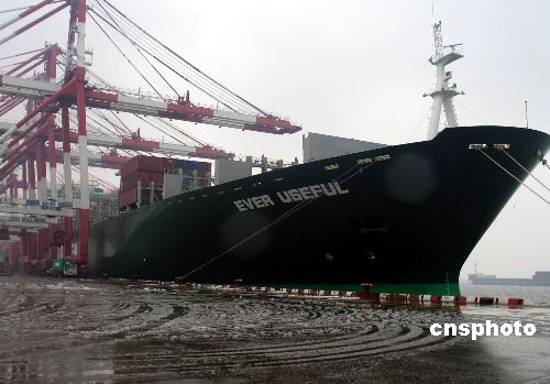 圖:上海外高橋碼頭受風雪影響貨輪延遲出港