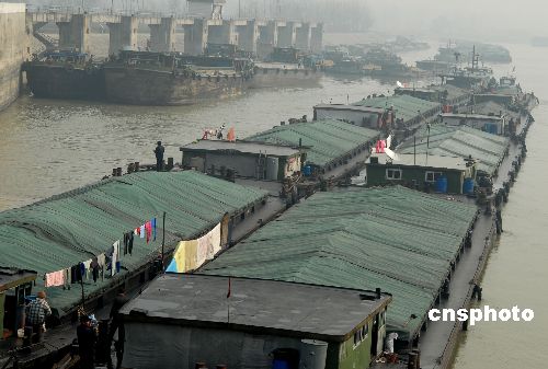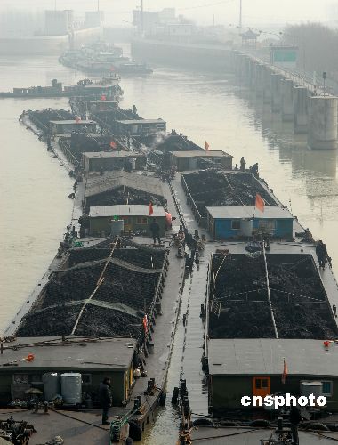 2月4日,運輸電煤的船隊通過京杭運河山東臺兒莊段船閘。由于近期大雪對南方運輸造成嚴重影響,各火力發(fā)電企業(yè)出現(xiàn)燃“煤”之急,連日來,京杭運河山東臺兒莊段船閘簡化工作程序,并優(yōu)先安排過閘,電煤運輸船舶隨到隨辦、隨辦隨走,當?shù)睾竭\、水上派出所還為電煤運輸船舶清道護航,全力確保航行安全。中新社發(fā) 高啟民 攝