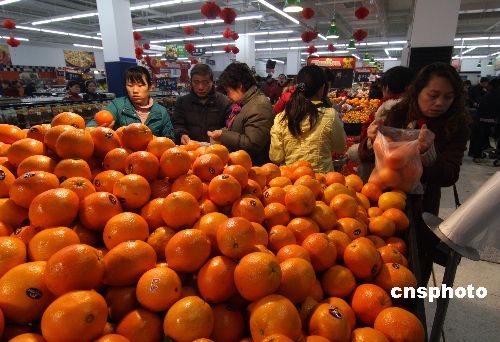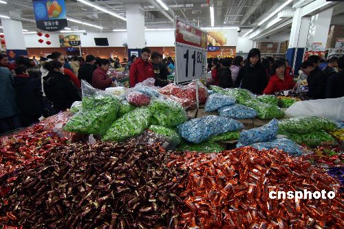 2月4日,婁底市民在超市選購(gòu)年貨。近日湖南婁底市遭受了50年一遇的冰凍災(zāi)害,全市95個(gè)鄉(xiāng)鎮(zhèn)不同程度受災(zāi),倒塌房屋15337間,緊急轉(zhuǎn)移安置11282人,因?yàn)?zāi)摔死2人,農(nóng)作物受災(zāi)面積108.71畝,當(dāng)?shù)馗咚俟贰?guó)道、省道在冰凍期間不暢通。在抗冰雪凍災(zāi)中,婁底市迅速采取應(yīng)對(duì)措施,市民及各企業(yè)單位共同參與,將冰凍災(zāi)害損失降到最低限度。隨著春節(jié)來(lái)臨,婁底市節(jié)日市場(chǎng)購(gòu)銷兩旺、貨足價(jià)穩(wěn),市民們紛紛忙于采買年貨。中新社發(fā) 郭國(guó)權(quán) 攝