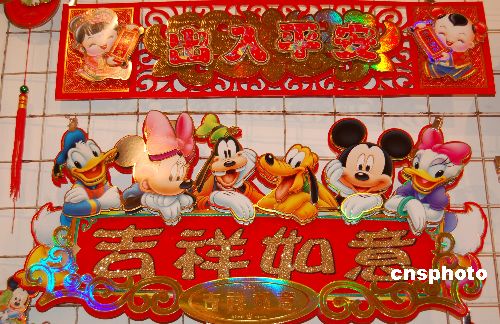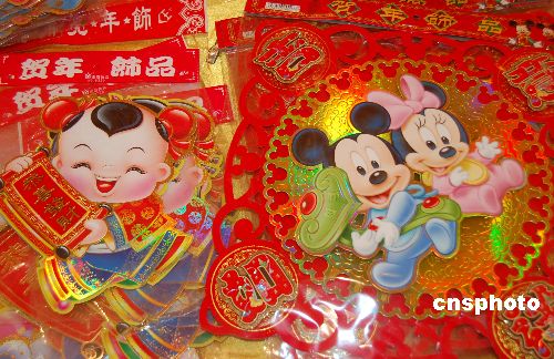 2月5日晚,廣西南寧街頭“米老鼠”造型的春節飾品。有八十年歷史的美國“米老鼠”,在中國農歷鼠年即將到來之際進軍中國春節市場受到歡迎。擁有四千多年歷史的中國最盛大、最熱鬧的傳統節日——春節,開始融入西方元素。中新社發 劉萬強 攝