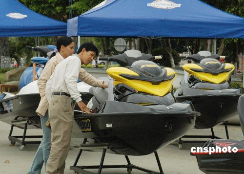 2月8日,游人在三亞鹿回頭廣場參觀豪華游艇。由三亞順業船舶設備有限公司和香港游艇廠商聯合舉辦的2008迎春游艇展覽會繼續在海南三亞鹿回頭廣場舉行,這是三亞首次舉行的大規模游艇展,展覽將持續到2月14日。所展出的圣斯克、夢特威、斯莎等品牌的豪華游艇、摩托艇、快艇以及加拿大龐巴迪品牌旗下的快艇、雪地車、沙灘車等海上運動休閑娛樂產品,春節期間吸引諸多三亞市民和游客參觀。中新社發 尹海明 攝