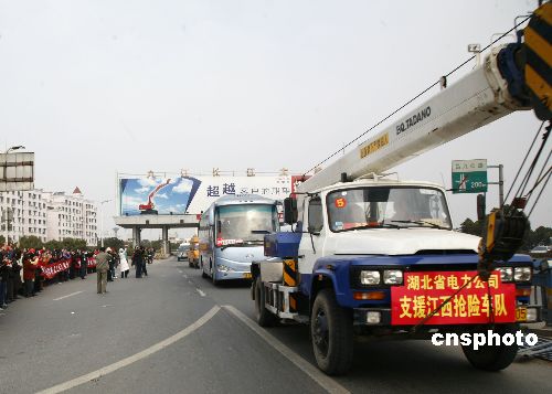 2月10日上午11時(shí)許,由171輛車(chē)組成的湖北支援江西電網(wǎng)的搶修車(chē)隊(duì)通過(guò)九江長(zhǎng)江大橋抵達(dá)江西,搶修人員將趕赴咸夢(mèng)線的搶修工地,修復(fù)咸夢(mèng)線江西段134公里長(zhǎng)受損電網(wǎng)。中新社發(fā) shendudu 攝