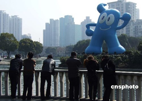 上海世博會吉祥物“海寶”現身新天地以來,吸引了許多中外游客。2月28日,聳立在太平湖面上的大個子海寶,成為城市一景。中新社發 蔣振雄