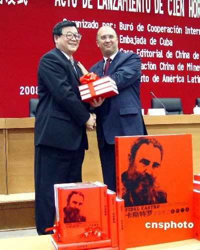 三月七日,古巴領(lǐng)袖菲德爾·卡斯特羅中文版自傳《卡斯特羅訪談傳記:我的一生》首發(fā)式在北京中國社科院舉行,他親自為該書撰寫了序言《致中國人民》,并在其中表示“在二十一世紀(jì)的世界形勢下,應(yīng)該依靠中國”。圖為中國社科院副院長王偉光向古巴駐華大使卡洛斯·米格爾·佩雷拉贈(zèng)送中文版自傳。中新社發(fā) 應(yīng)妮 攝