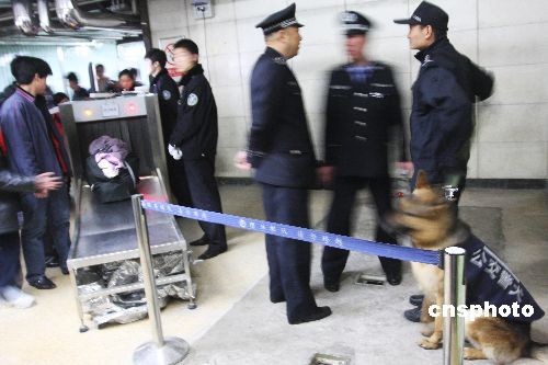3月7日,北京東直門地鐵車站里,一些民警正帶著他們的公交警犬執(zhí)勤,對(duì)旅客的行李進(jìn)行安檢,以確保“兩會(huì)”期間旅客的出行安全。中新社發(fā) 追影 攝