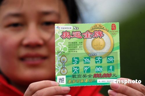 2008年3月23日,山東省濰坊市在該市風箏廣場舉辦“奧運彩票與圣火同行”奧運彩票“頂呱刮”首發儀式。當日,奧運彩票“頂呱刮”在濰坊率先上市。據了解,該奧運彩票為國內首創即開即兌型體育彩票。此次上市的奧運即開型體育彩票在技術、玩法及設計上均區別于以往傳統的即開彩票,一張彩票最多有12次中獎機會,最高獎金可達25萬元!绊斶晒巍眾W運體育彩票將于3月24開始在山東、江蘇、浙江、河北四省試點銷售。 中新社發 王志德 攝