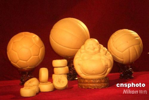 中新網北京四月十五日電 (王歡)中國農民用先進科技培育出的世界上獨一無二的足、籃、排三大球造型葫蘆,今天在北京國際會議中心亮相,他們的培育者查泰山將這些“葫蘆”工藝品贈送給中國體育博物館,表達了中國億萬農民對北京奧運會的祝福和期盼。