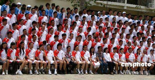 北京奧運圣火即將進入海南三亞開始內地傳遞。5月3日,將在三亞進行圣火傳遞的二百多名火炬手聚集一堂舉行火炬手大會,會后一起合影留念。中新社發 周兆軍 攝