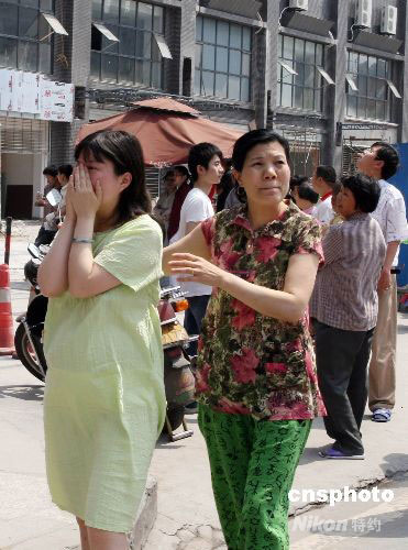 5月12日14時40分許,重慶各區(qū)縣出現(xiàn)強烈震感,重慶主城的通訊設施一度不通。據(jù)重慶市地震局局長陳鐵流稱,重慶出現(xiàn)震感是由四川汶川地震波及所致。圖為一名孕婦跑出高樓后驚魂未定。中新社發(fā) 郭晉嘉 攝