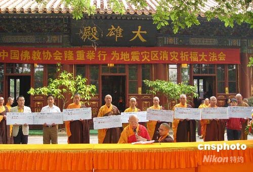 四川省汶川縣發(fā)生七點(diǎn)八級地震后,中國佛教協(xié)會十四日上午在北京廣濟(jì)寺隆重舉行消災(zāi)祈福大法會,F(xiàn)場賑災(zāi)捐款絡(luò)繹不絕,十一世班禪大師捐款十萬元人民幣。中新社發(fā) 徐長安 攝
