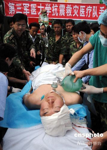 5月15日,解放軍第三軍醫(yī)大學(xué)“抗震救災(zāi)醫(yī)療隊(duì)”在四川地震災(zāi)區(qū)使用野戰(zhàn)手術(shù)車對(duì)受傷災(zāi)民進(jìn)行救治。據(jù)了解,這種野戰(zhàn)手術(shù)車可同時(shí)進(jìn)行兩臺(tái)手術(shù),車體內(nèi)配有呼吸機(jī)、麻醉機(jī)、心電監(jiān)護(hù)儀、多功能電切刀和空調(diào)等設(shè)備,為救治更多的傷員提供了保障。目前,該醫(yī)療隊(duì)已完成包括16例重癥顱腦損傷在內(nèi)的各類手術(shù)近200例。圖為一名受傷災(zāi)民成功接受手術(shù)后被送出野戰(zhàn)手術(shù)車。中新社發(fā) 范忠武 攝