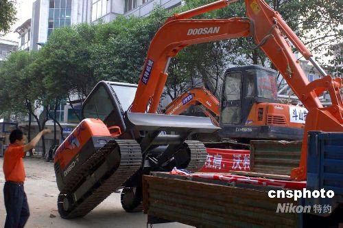 2008年5月15日,地震災(zāi)區(qū)都江堰市危樓排險(xiǎn)工作正在進(jìn)行中。目前來自成都市企業(yè)的志愿抗震救災(zāi)隊(duì)伍攜帶大型機(jī)械車輛開進(jìn)都江堰市區(qū),與解放軍部隊(duì)一起展開危樓居民區(qū)的排險(xiǎn)、救災(zāi)、防疫工作。圖為成都市一企業(yè),派數(shù)量可觀的大小挖掘機(jī)和破損機(jī)進(jìn)入江堰市危樓疏散區(qū)。汶川7.8級地震,給都江堰市帶來巨大破壞。目前危樓居民區(qū)疏散、安置工作已展開,取得一定成果。中新社發(fā) 鄒憲 攝
