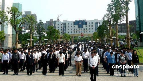 5月19日, 揚(yáng)州市委、市人大、市政府、市政協(xié),各區(qū)委、區(qū)政府及市直有關(guān)部門下半旗,沉痛哀悼四川地震遇難同胞。14時(shí)28分起,全市人民默哀3分鐘,汽車、火車、船舶鳴笛,各防空警報(bào)點(diǎn)防空警報(bào)鳴響。在全國哀悼日期間,停止公共娛樂活動,開展一系列的哀悼活動,以表哀思。截至18日晚,揚(yáng)州市募集賑災(zāi)捐款突破千萬元人民幣。圖為揚(yáng)州市政府大院全體工作人員胸佩白花集體列隊(duì)默哀。中新社發(fā) 崔佳明 攝