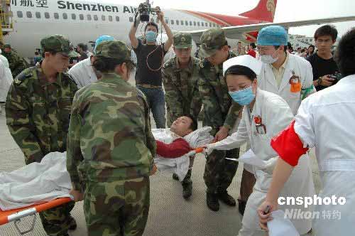 5月22日15時40分,深圳航空公司一架波音737飛機(jī)準(zhǔn)時將38名四川災(zāi)區(qū)傷員運抵南寧國際機(jī)場。大批早已集結(jié)在此的醫(yī)護(hù)人員迅速將傷員轉(zhuǎn)運至南寧各大醫(yī)院。當(dāng)天將有4架飛機(jī)共144名傷員運至南寧,這些在地震中經(jīng)歷了生死瞬間的四川同胞,將分別被安排在廣西醫(yī)科大學(xué)第一附屬醫(yī)院等四個醫(yī)院進(jìn)行后續(xù)治療。中新社發(fā) 蔣雪林 攝