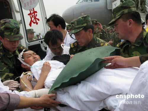 5月24日,醫護人員在柳州白蓮迅速將從四川地震災區轉運來的受傷人員送至柳州市人民醫院。此批傷員來自四川的南充市和資陽市,傷員多為骨折傷患,年齡最大的89歲,最小的14歲。柳州方面表示,將以最好的醫療條件,最好醫療專家全力醫治傷者。中新社發 周瀟男 攝