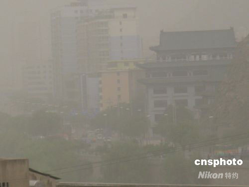 5月29日凌晨,蘭州發生沙塵暴,能見度不到200米,這是蘭州今年第4次發生沙塵暴。圖為蘭州金城關至龍園被灰蒙蒙的沙塵暴籠罩。中新社發 張玉璽 攝