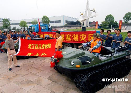 5月30日上午,浙江義烏,兩輛“西貝虎”水陸兩棲全地形車啟程前往四川北川唐家山堰塞湖搶險。目前唐家山堰塞湖的總儲水量已達1.4億立方米,而且每天以500立方米的速度遞增,一旦發生潰壩,將危及下游130多萬人的生命財產。28日剛從什邡回來的義烏西貝文良特種車輛有限公司領導,又接到唐家山堰塞湖防洪搶險指揮部急需用水陸兩棲全地形車電話。該公司連夜組織加班,突擊生產了兩輛性能最優的水陸兩棲全地形車,并根據唐家山堰塞湖搶險可能遇到的困難,增配了自動牽引鉤、牽引鋼絲繩、爬坡履帶、水上推進的螺旋槳等。30日中午,陳根林等四名剛從什邡抗震救災前線回來的公司職工,組成“西貝虎”搶險突擊隊,再赴抗震救災前線搶險。中新社發 張建成 攝