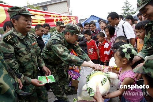 五月三十一日,四川省都江堰市紫坪鋪鎮望江村的孩子們收到了部隊贈送的兒童節禮物。四川預備役高射炮步兵師四團負責都江堰市望江、黎明、白沙三個行政村的救災工作。兒童節前夕,該團為孩子們準備了書包、玩具,送給當地的孩子們。中新社發 慎重 攝