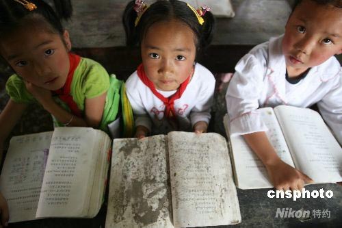 6月1日,家住四川安縣秀水鎮大泉村的小學生胡一凡在新建成的秀水三小上課。由于原來學校的教室在地震中倒塌,胡一凡已經有19天沒有上課讀書了。在新建成的教室里,盡管課本沾滿了泥水,但她已經很滿足了。中新社發 董亮 攝
