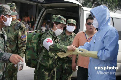 6月2日,在四川地震災(zāi)區(qū)都江堰玉堂鎮(zhèn)房屋廢墟清理現(xiàn)場(chǎng),一個(gè)穿著衛(wèi)生服的漂亮姑娘忙著為災(zāi)民抱扎傷口,講解防疫知識(shí),給官兵發(fā)放防護(hù)器具。這個(gè)忙碌的姑娘是濟(jì)南軍區(qū)總醫(yī)院護(hù)士張麗娜,6月2日是她預(yù)定的結(jié)婚日子。此時(shí)家中為了婚禮格外忙碌,而她卻依然在災(zāi)區(qū)的廢墟上工作。圖為張麗娜在救災(zāi)現(xiàn)場(chǎng)幫同事穿戴防護(hù)服。中新社發(fā) 仇成梁 攝