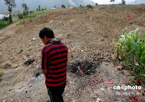 6月15日,四川汶川大地震災(zāi)區(qū)民眾度過難忘的父親節(jié)。圖為映秀鎮(zhèn)一位幸存男孩來到此次地震遇難者千人公墓大土堆前,默默想念埋葬在這里的遇難父親和家人。中新社發(fā) 賈國榮 攝