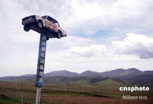 6月23日,青海省青海湖交通管理部門(mén)將事故真車(chē)架在寫(xiě)有交通警示語(yǔ)的柱子上,警示交通安全。中新社發(fā) 廖攀 攝