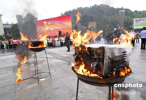 6月26日,國際禁毒日。浙江溫嶺市在東輝公園舉行廣場禁毒宣傳暨毒品焚燒儀式,焚燒海洛英、冰毒、麻古、搖頭丸等毒品20512克,總案值1600多萬元。溫嶺市還舉行了圖片展覽和簽名儀式,向群眾宣傳禁毒。中新社發 吳鵬飛 攝
