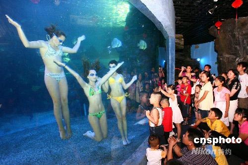 6月27日開始,福州左海海底世界再次邀請俄羅斯水中運動員前來表演,他們向市民們展示富有世界盛名的花樣游泳——水下芭蕾,促進市民們更加關注奧運賽事。據介紹,本次表演隊來自俄羅斯遠東奧林匹克運動中心,她們年齡在14-20歲,是專業的花樣游泳運動員,從四歲起就進行了形體、舞蹈、體操芭蕾等方面的專業訓練,曾榮獲俄羅斯花樣游泳錦標賽青少年組第二名。 在左海海底隧道大鯊魚展池中,俄羅斯姑娘們不帶任何潛水裝備,憑著自己高超的水中技能,共同完成一個又一個高難度的動作,綻放的石榴花、佛座蓮花、芙蓉盛開、穿梭時空、南海觀音、轉體720度等形體造型定變幻多姿,精彩絕倫。中新社發 祝敏松 攝