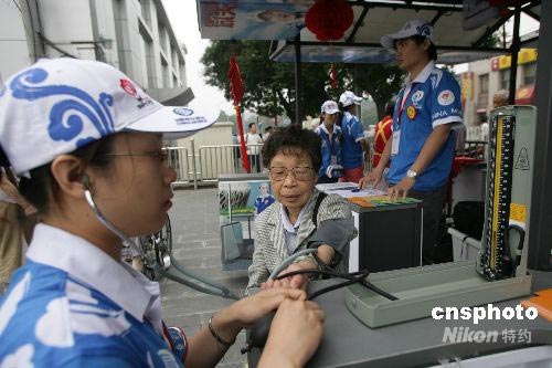 7月1日,北京40萬名城市志愿者在全市500多個志愿者崗亭正式上崗,位于東四北大街的東四奧林匹克社區(qū)的志愿者崗亭里,志愿者們都在忙忙碌碌的進行著志愿服務,圖為志愿者義務為市民測量血壓。中新社發(fā) 杜洋 攝