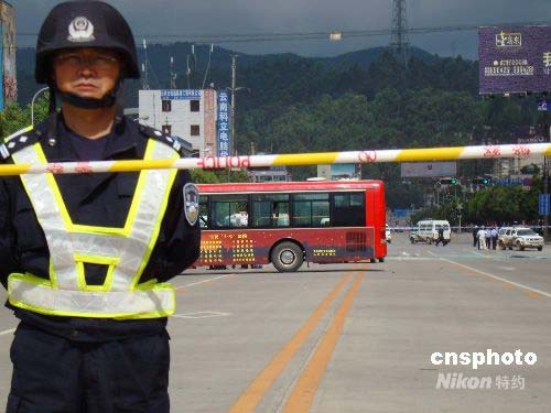 7月21日上午7時10分、8時05分左右,在云南省昆明市人民西路云大醫院側門、昌源路與人民西路交叉口分別發生公共汽車爆炸案。圖為警方在昌源路與人民西路交叉口爆炸現場拉起警戒線,禁止一切行人車輛通過。中新社發 楊洋 攝