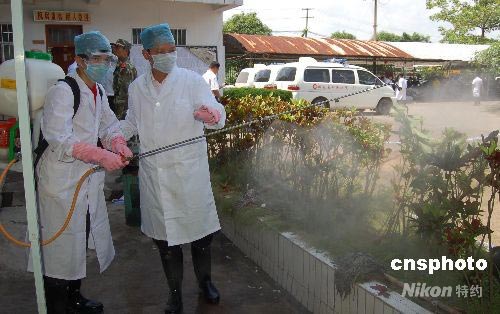 7月25日,廣西百色“7·21”煤礦透水事故已經(jīng)進(jìn)入第5天,仍有29名礦工被困井下,生死不明,礦區(qū)開始全面消毒。該事故致使57人被困,其中21人獲救,7人遇難,29人至今被困。中新社發(fā) 劉萬強(qiáng) 攝