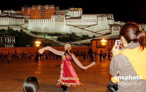 7月26日,游客在布達拉宮廣場上拍照留念。7月的拉薩綠樹成蔭,鮮花錦簇,在明媚的陽光下,來自世界各地的游客云集,拉薩又到旅游旺季,已經走出“3.14”打砸搶燒暴力事件的陰影。據估計,7月份開放入境游,當月旅游人數將達到35萬人次。中新社發 周波 攝