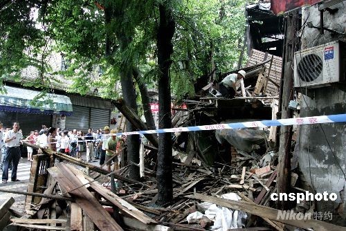 7月30日清晨,受今年第八號臺風“鳳凰”影響,福州市臺江區隆平巷一兩層木屋在雨中倒塌,當時屋內有一家3口,其中父子兩人受傷。中新社發 小小 攝