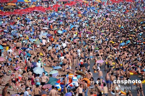 奧運會臨近,中外游人紛紛來到奧帆賽舉辦地青島觀光看奧帆賽。臺風“鳳凰”影響過后,青島各海濱浴場陸續向游人開放。八月三日,青島第一海水浴場的中外游人突破十萬人,是今年入夏以來青島第一海水浴場的最高紀錄。中新社發 曲連遵 攝