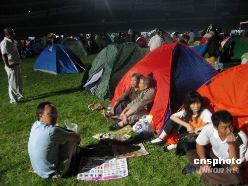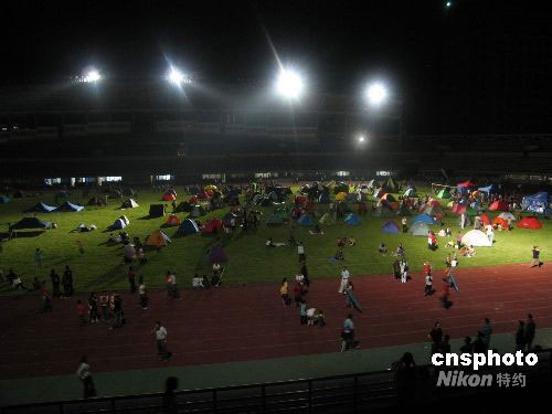 九月一日晚,上千名攀枝花市民在攀枝花體育場搭帳篷過夜。因害怕再次發(fā)生余震,許多市民從家里搬到了體育場內(nèi)。體育場已免費向市民開放,并二十四小時提供熱水。中新社發(fā) 劉子倩 攝
