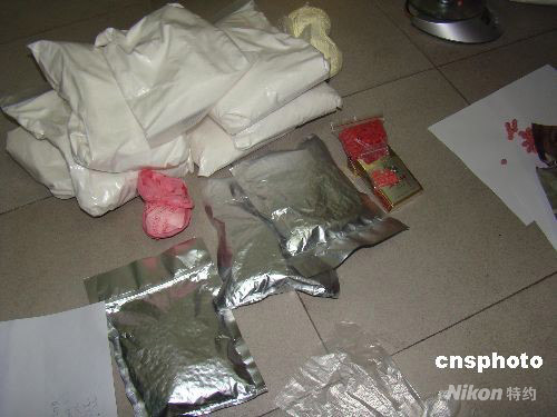海口警方九月四日公布破獲一起特大販賣毒品的案件,繳獲毒品十公斤,抓捕毒販?zhǔn)墙衲暌詠砗D鲜∑偏@的最大宗販毒案,毒品品種包括海洛因、冰毒、K粉、搖頭丸等六七個(gè)品種。中新社發(fā) 王辛莉 攝