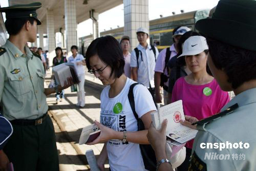 9月8日下午,來自全國各地的近100名赴朝鮮參加四日游的游客從丹東火車站登上丹東至新義洲的旅游專列。隨著朝鮮作為旅游目的地國的政策的推進,加之八九月份朝鮮“阿里郎”旅游項目的增加,赴朝旅游的中國公民數(shù)量不斷上升。丹東邊檢積極應(yīng)對,保證游客安全順利通關(guān);而丹東市九家擁有辦理赴朝鮮旅游資格的旅行社也正積極準(zhǔn)備,迎接明年開始的大規(guī)模赴朝游活動。中新社發(fā) 陳浩浩 攝
