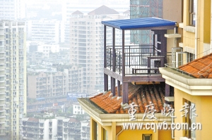 32樓的高空竟搭建起一個(gè)近20平米的陽(yáng)臺(tái)(如圖)。除了驚嘆,網(wǎng)友們戲稱之為“重慶最牛陽(yáng)臺(tái)”、“重慶第九奇跡建筑”。