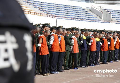 9月18日中午11時(shí),新疆伊犁州公、檢、法等部門(mén)在伊寧市體育場(chǎng)舉行公捕公判大會(huì)。公判大會(huì)上,新疆自治區(qū)高級(jí)人民法院伊犁州分院對(duì)買(mǎi)買(mǎi)提艾力.阿不都熱合曼等12名犯罪分子進(jìn)行公開(kāi)宣判,對(duì)艾力.庫(kù)那洪等12名危害國(guó)家安全及嚴(yán)重?cái)_亂社會(huì)秩序的犯罪嫌疑人公開(kāi)執(zhí)行逮捕。中新社發(fā) 李志剛 攝