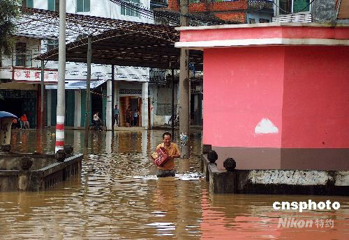 受“黑格比”影響,地處中越邊境的廣西龍州縣受來自越南水口河、平兒河兩河水暴漲影響,9月26日左江龍州水文站水位達116.21米,并以每小時0.52米的速度上漲。至當天下午18點,水位已達120.01米,造成龍州縣城的青龍橋、合龍街、白沙街、利民街等部分低洼地段民房、商鋪受淹。由于預防措施到位,及時轉移物品,損失不大。但沿江的上金鄉農作物部分受淹。沒有人員傷亡報告。圖為青龍橋路段受淹,居民在趟水搶救物品。中新社發 馮文 攝