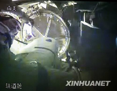 9月27日,航天員翟志剛在神舟七號載人飛船軌道艙進行出艙前的準備工作(攝于北京航天飛行控制中心大屏幕)。當日中午,航天員出艙活動任務開始。新華社記者查春明攝