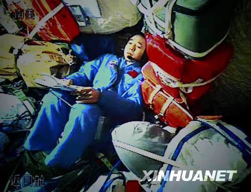 9月27日,航天員景海鵬在神舟七號載人飛船返回艙與地面通話(攝于北京航天飛行控制中心大屏幕)。當日中午,航天員出艙活動任務開始。新華社記者查春明攝