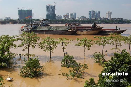 9月29日,邕江(珠江上游)8年以來最大洪峰通過廣西南寧,沿江兩岸大堤下許多樹木和路燈被淹沒。今年第14號臺風“黑格比”盡管已經遠離消失,但給廣西帶動來的影響最近幾天仍在繼續,江河水位不斷上漲。南寧市邕江水位當天下午2點前后達到75.83米,超警戒水位2.86米,為2001年以來的最大洪峰。中新社發 劉萬強 攝
