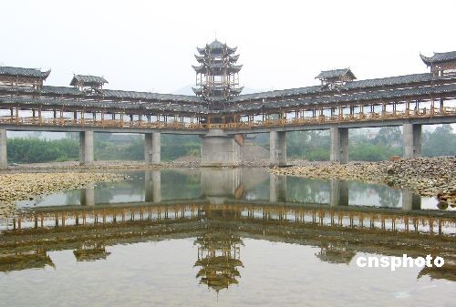 10月3日,湖南省湘西土家族苗族自治州龍山縣苗兒灘鎮撈車惹巴土家風雨橋,在秋雨蒙蒙中,恍如一幅俊秀的山水畫。風雨橋全長為288.8米,比世界紀錄保持者252米長的芷江龍津風雨橋還要長36.8米,成為世界上最長最具土家特色的土家風雨橋,創造了風雨橋的新記錄。中新社發 唐榮沛 攝
