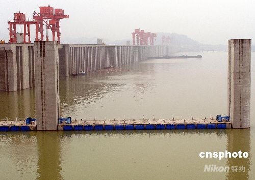 2008年10月7日,經(jīng)過近10天持續(xù)不斷地蓄水,三峽工程大壩壩前水位達(dá)到155.5米,并保持在該水位以上運(yùn)行,實(shí)現(xiàn)了2008年汛后先期蓄水至156米水位的目標(biāo),是否向175米水位抬升尚需再檢測并研究三峽大壩運(yùn)行情況、三峽庫區(qū)地質(zhì)災(zāi)害狀況等之后再做決定。按設(shè)計(jì)要求,三峽工程分135米、156米、175米三個水位進(jìn)行蓄水。此前,三峽工程已于2006年、2007年兩次蓄至156米水位高程。中新社發(fā) 劉君鳳 攝