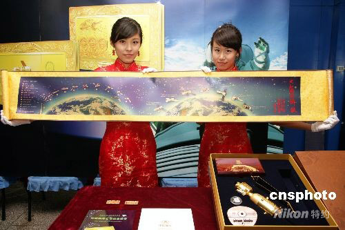 圖為工作人員展示為配合“神七”紀念金條發行的一幅1.6米神舟七號載人航天飛行紀念純金藏卷。