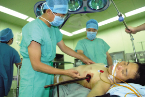 來(lái)到醫(yī)院后王女士已經(jīng)出現(xiàn)意識(shí)模糊,同時(shí)伴有劇烈的胸痛。胸外科主任張臨友教授和副主任徐廣全教授迅速組織相關(guān)科室人員會(huì)診,爭(zhēng)取快速摸清患者胸腔內(nèi)的情況和鋼筋對(duì)各器官造成的損傷。由于消防隊(duì)員在切割鋼筋時(shí)怕傷到王女士,所以切割點(diǎn)離傷口較遠(yuǎn),造成留在體外的鋼筋較長(zhǎng),傷者無(wú)法進(jìn)入CT拍攝影像,給診斷帶來(lái)了很大的困難。醫(yī)生只得為王女士進(jìn)行了胸部的X光片檢查。依靠豐富的臨床經(jīng)驗(yàn)和X光片,醫(yī)生判斷王女士的肺組織已經(jīng)損傷,必須立即開(kāi)胸探查。